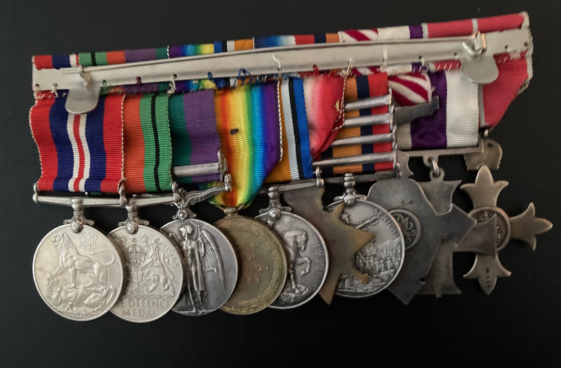 O.B.E. 1st. type Military, M.C. (GV), A.F.C. (GV), Q.S.A. 4 clasps, C.C., O.F.S., Tr., S.A.1902 (Pte. R. Irish F.), 1914 Star & Bar (Pte. R. Ir. Fus.), B.W.M. Victory (MID) (Capt. R.F.C.), G.S.M. clasp Kurdistan (S/L. R.A.F.), Defence Medal, War Medal.