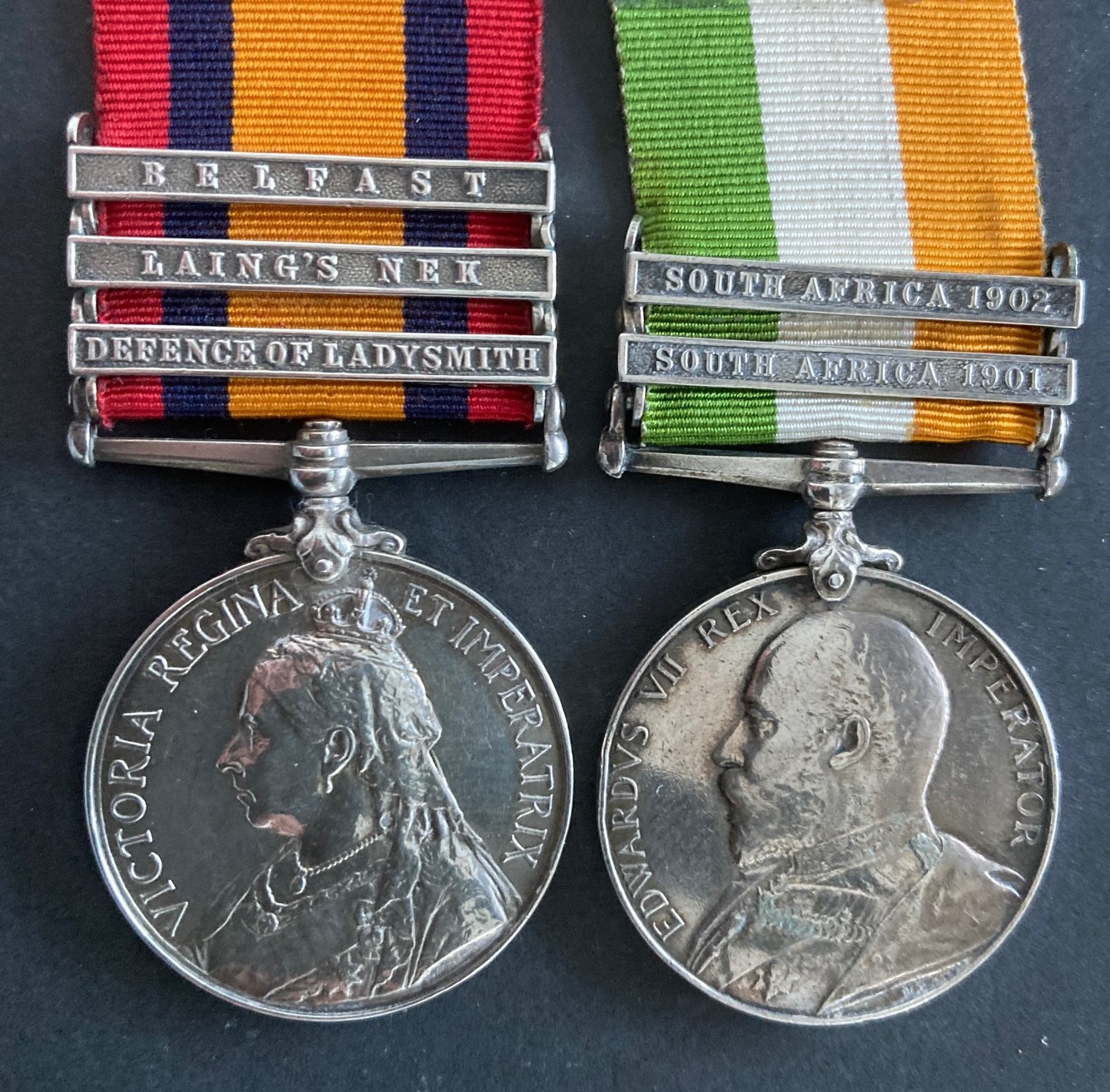 Q.S.A. 3 clasps, Defence of Ladysmith, L. Nek., Belf. K.S.A. 2 clasps.